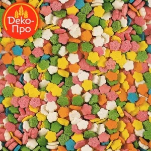 Состав: сахар, мука рисовая, масло пальмовое, носитель (Е1422), декстроза, загустители (Е415, Е466), эмульгаторы (лецитин соевый, Е432), глазирователь (шеллак), красители (Е102, Е110, Е120, Е133), ароматизатор "Ванилин", антиокислители (аскорбиновая кислота, Е306).